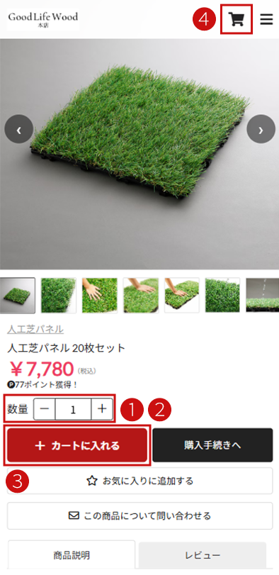 ③「カートに入れる」でカートに商品追加するのみ、もしくは「購入手続きへ」でカートに追加+お支払い画面へ