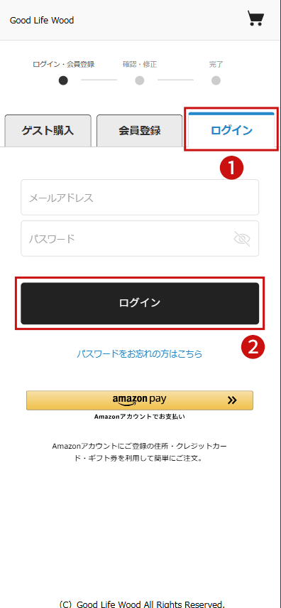 ①会員のお客様はログインを選択し、メールアドレスとパスワードをご記入ください。