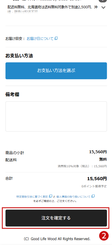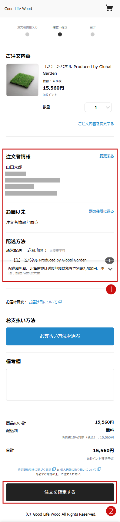 ①お届け先/配送方法/お支払い方法をご確認いただき、②注文確定ボタンを押してください。